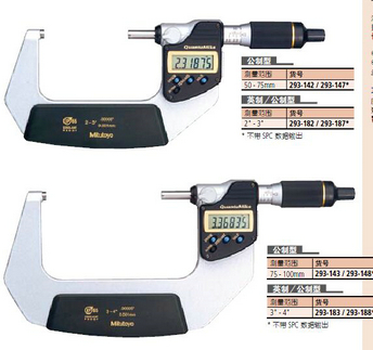 *不(bù)帶SPC數(shù)據輸出貨号 測量範圍 293-140 / 293-145* 0-25mm 293-141 / 293-146* 25-50mm 293-142 / 293-147* 50-75mm 293-143 / 293-148* 75-100mm